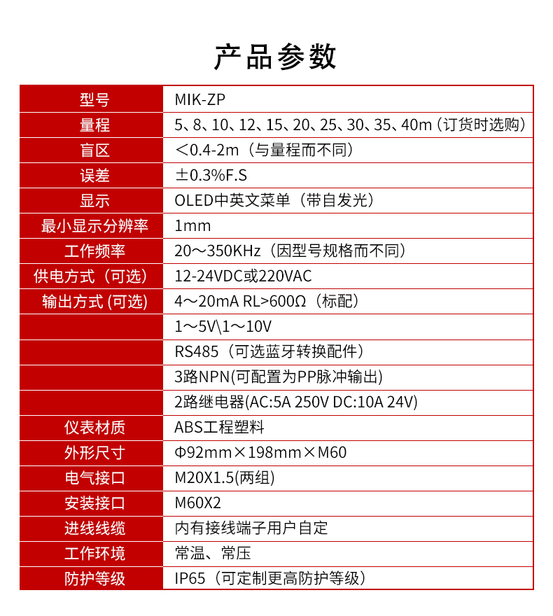 MIK-ZP超聲波液位計利用發射超聲波經物位或液位,反射后所需要的時間來計算距離。因其不接觸介質,安裝維修方便等性能在如今的工業現場應用越來越多。可廣泛應用于各種液體和固體物料高度的測量,特別是在某些衛生型要求高的現場有著不可取代的優勢。