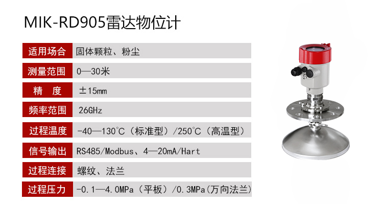 MIK-RD903/905雷達物位計天線發射極窄的微波脈沖,這個脈沖以光速在空間傳播,遇到被測介質表面,其部分能量被反射回來,被同一天線接收。發射脈神與接收脈沖的時間間隔與天線到被測介質表面的距離成正比。由于電磁波的傳播速度極高,發射脈神與接收脈神的時間間隔很小(納秒量級)很難確認,MIK—RD903/905高頻雷達物位計采用種特殊的解調技術,可以準確識別發射脈神與接收脈神的時間間隔,從而進一步計算出天線到被測質表面的距離。