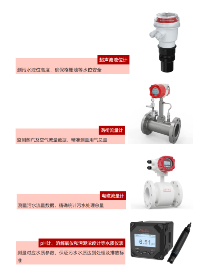 此次的現(xiàn)場(chǎng)應(yīng)用工況為典型的污水處理數(shù)據(jù)監(jiān)測(cè)場(chǎng)景,其中涉及的儀表及實(shí)現(xiàn)功能包括: