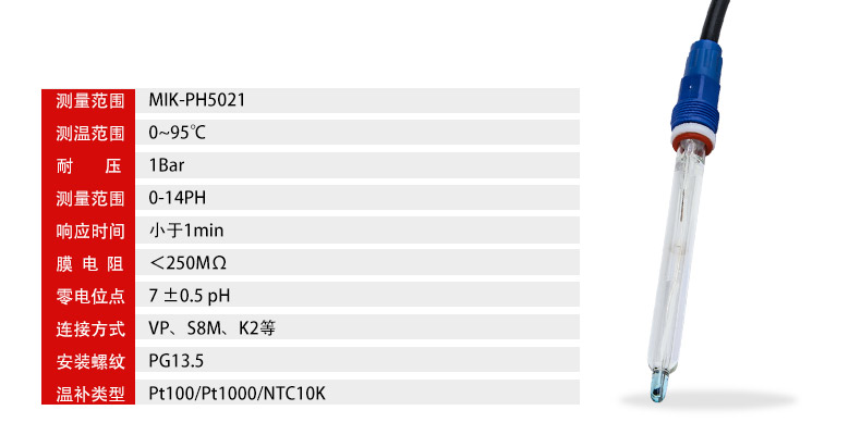 MIK-PH-5014玻璃電極是由耐氫氟酸的pH敏感玻璃膜制成,該電極能適用于含氫氟酸水體中的pH值測定。