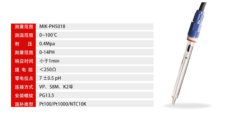 MIK-PH-5018在線高溫玻璃電極適用于測(cè)試溫度較高,有腐蝕性的介質(zhì)。電極敏感區(qū)域大、抗機(jī)械沖擊強(qiáng)、響應(yīng)快和穩(wěn)定性好。該電極能廣泛用于微生物技術(shù)、制藥、食品飲料、制糖,包括氯堿、采礦冶煉、造紙、紙漿、紡織品、石油化工、半導(dǎo)體電子工業(yè)等各種化工流程及廢水處理等領(lǐng)域。