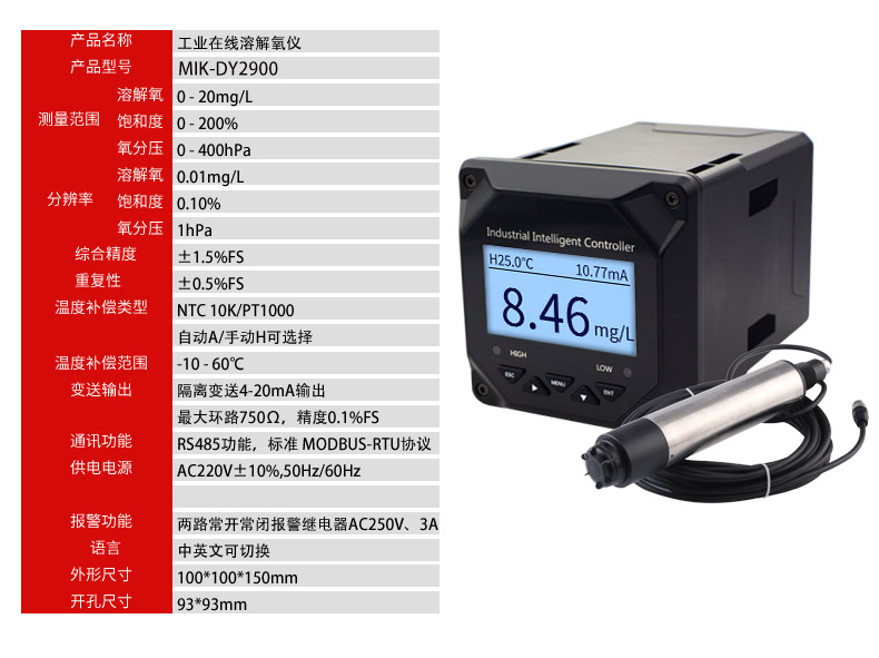 19857007412MIK-DY2900熒光法溶解氧儀是一款智能在線化學分析儀器,廣泛應用于火電、化工、化肥、冶金、環保、制藥、生化、食品和自來水等行業中的溶解氧、飽和度和溫度的連續監測。由于熒光法溶解氧儀采用熒光法測量溶解氧,測量時不會產生氧消耗,不存在干擾,不用極化,不光在復雜工況下有良好的表現,熒光帽設計壽命可達一年以上,大大降低了維護成本。