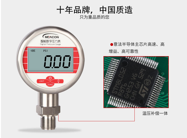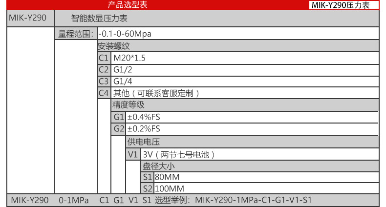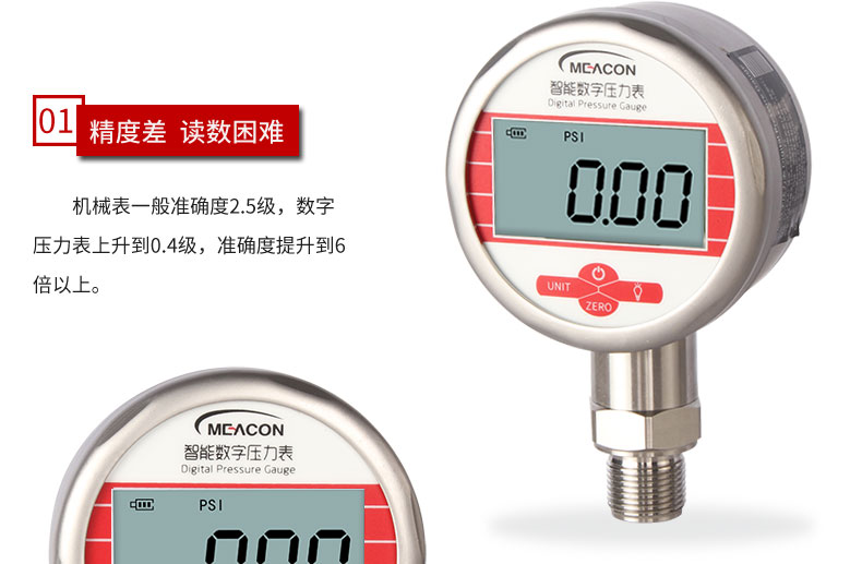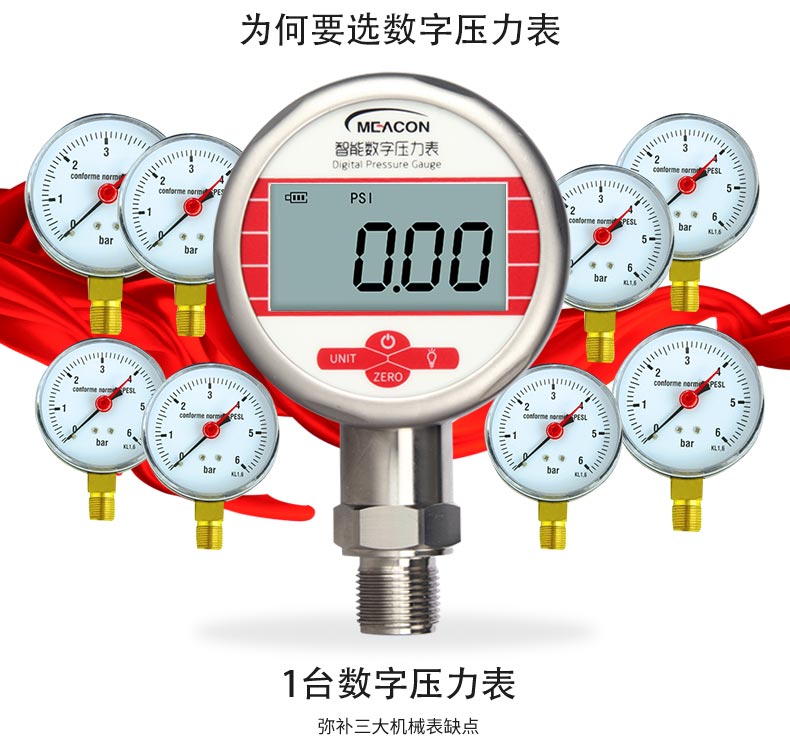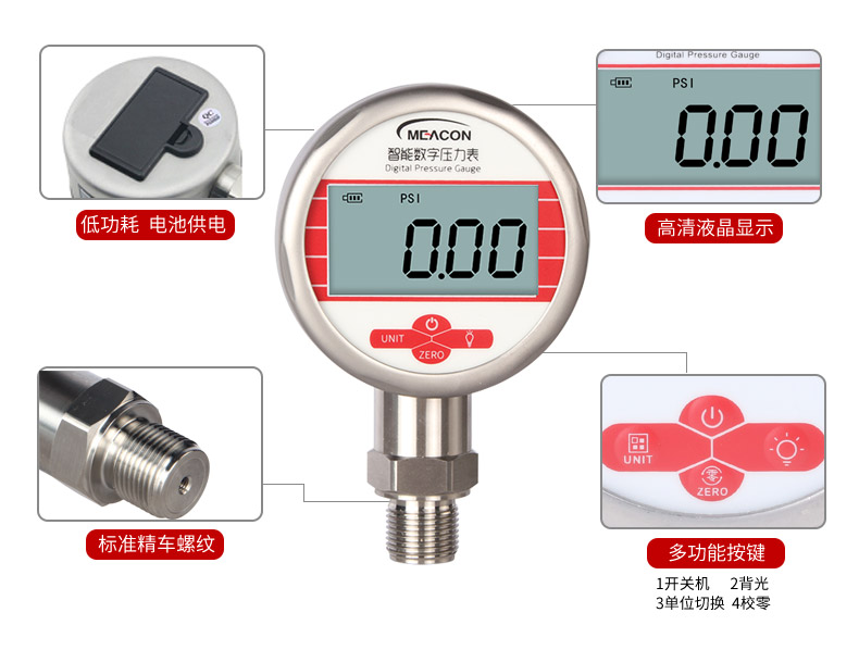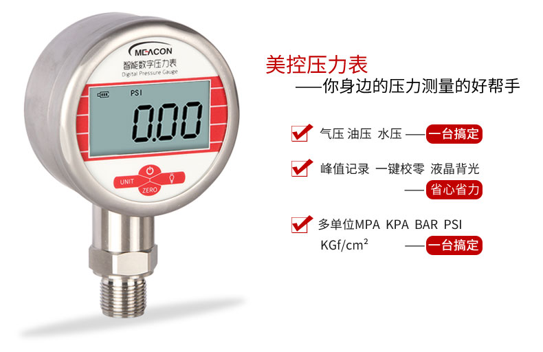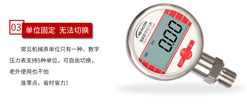 19857007412? MIK-Y290數顯壓力表,內置高精度壓力傳感器,能夠準確實時顯示壓力,并且具有抗震動、顯示精度高、穩定性高、可清零等特點。該款智能壓力表采用LCD顯示屏,具有背光、單位切換等多種功能,操作簡單,安裝簡捷。由于采用低功耗的處理器芯片,續航時間長,該壓力表具有自動待機與一鍵清零功能,使用方便。該款智能數顯壓力表可以測量水、油、空氣等對不銹鋼無腐蝕的介質,適合壓力容器、自動化設備、實驗室設備配套的使用。