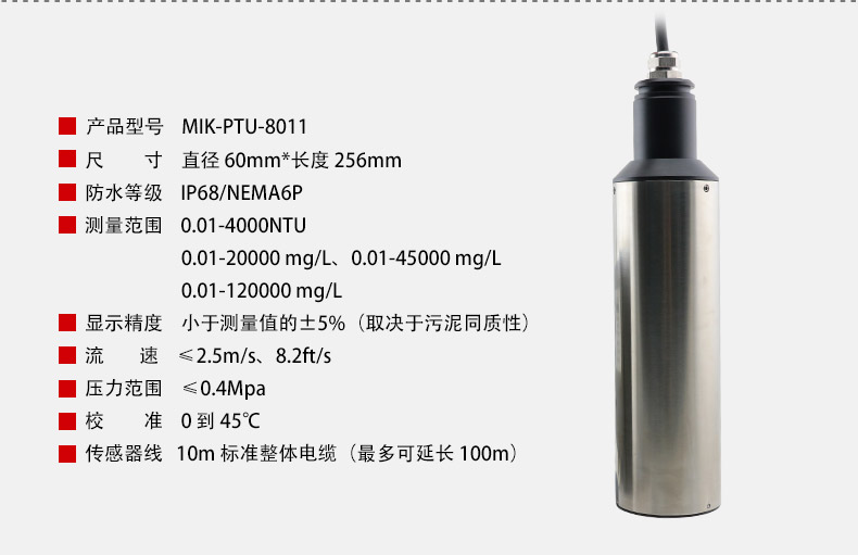 MIK-PTU100濁度/污泥濃度傳感器的原理基于組合紅外吸收散射光線法,應用國際濁度測定標準ISO7027方法可以連續并精確地測定濁度或污泥濃度。