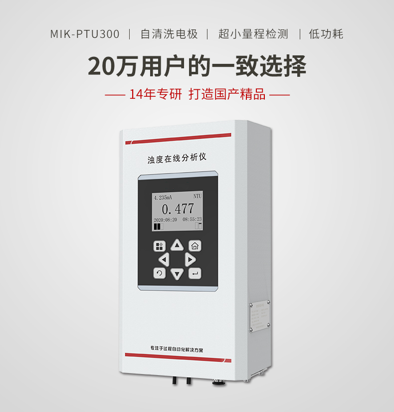 MIK-PTU300濁度在線分析儀是針對飲用水水質在線監測,量身研發的具有自主 知識產權的專利產品,具有超低濁度檢出限、高精度測量、設備長時間 免維護、省水工作和數字化輸出的特點,支持云平臺和手機移動端數據 遠程監控,以及 RS485-modbus 通訊,可廣泛應用于自來水出廠水、二次 供水、管網末梢水、直飲水、膜過濾水、游泳池、地表水等濁度在線監測。